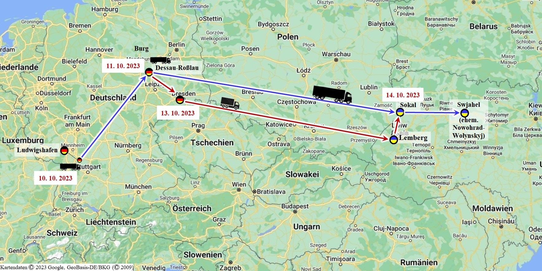10. bis 12. 3. 23: Bei der 13. Hilfstour werden 45 Tonnen Hilfsgüter nach Sokal gebracht und es wird dort über die Möglichkeit einer Städtepartnerschaft mit Dessau-Roßlau gesprochen.