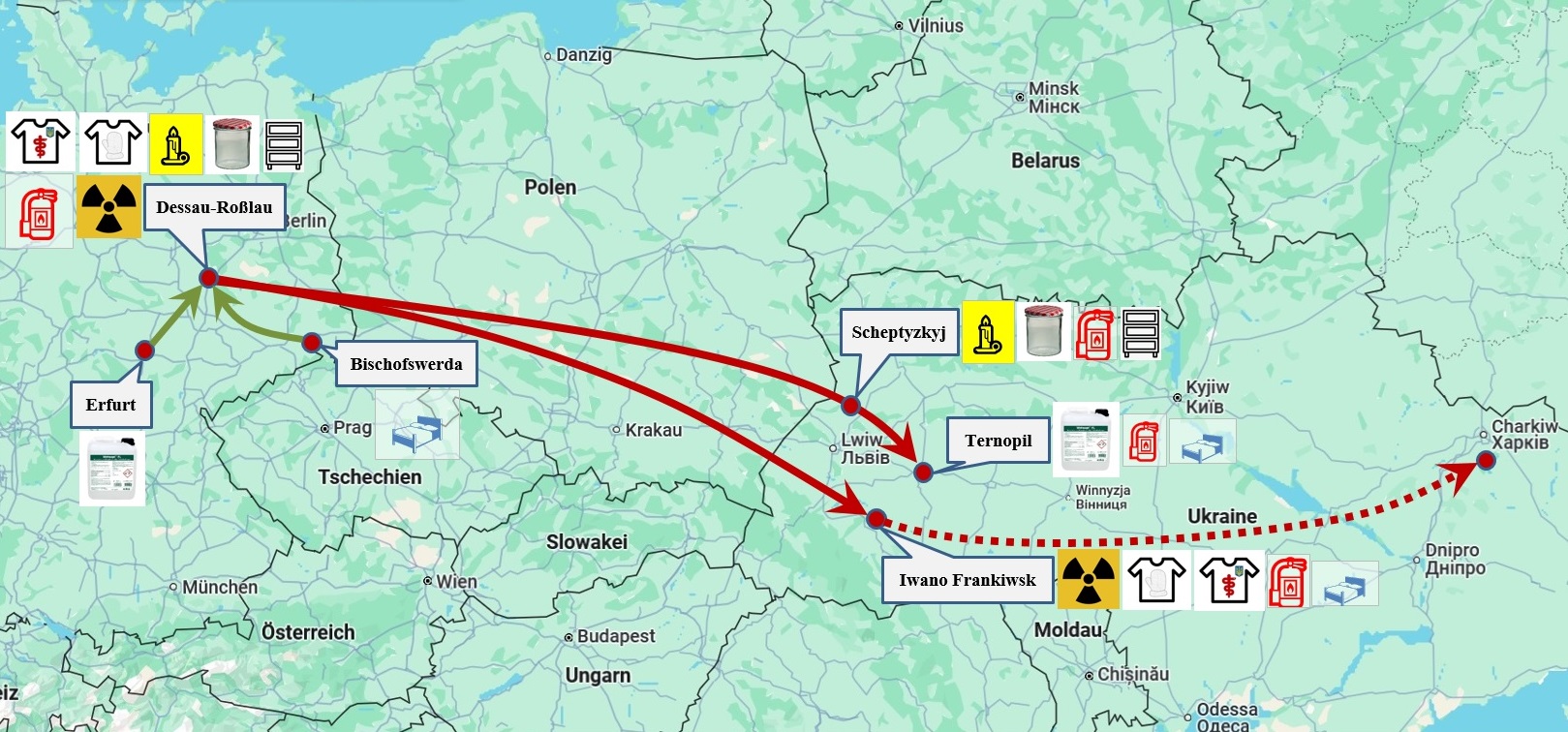 22./23. März 2025: Wie bei der Fahrt Anfang Dezember 2024 arbeiten die Ukrainehilfe Dessau-Roßlau und die Freundschaftsbrücke Ukraine wieder zusammen, um Hilfsgüter zusammenzutragen und zu laden sowie um den Transport zu finanzieren. So werden am 21. und 22. Am März zwei 40tonner beladen. Am 23. März brechen die beiden LKWs in die Ukraine auf. Für die Ukrainehilfe Dessau-Roßlau fährt ein LKW die folgenden Hilfsgüter nach Iwano-Frankiswsk, wo sie von einer ukrainischen Hilfsorganisation übernommen und mit einem anderen LKW in das Gebiet Charkiw gebracht werden sollen: • 8 Krankenhausbetten; • Einrichtungsgegenstände einer Chirurgiepraxis und Verbandsmaterial; • 780 kg Wechselkleidung für Soldaten im Krankenhaus; • 480 kg Winterkleidung für Zivilisten; • 250 kg Bettwäsche; • 490 kg Sanitärartikel; • 18 Fahrräder und • 250 Feuerlöscher. Der zweite LKW fährt für die Freundschaftsbrücke Ukraine mit folgender Ladung nach Scheptyzkyj, wo ein Teil zur Weiterverteilung übergeben wird und dann weiter nach Ternopil zur zentralen Verteilstation des ukrainischen Gesundheitsministeriums. Für Scheptyzkyj sind es • 250 kg Lebensmittel; • 670 kg Metalldeckelgläser; • 760 kg Wachs für die Herstellung von Wachsbrennern; • 210 kg Kleidung; • 16 Fahrräder; • 300 Feuerlöscher und • 760 kg Teile eines Metallregalsystemes für die Caritas in Schowkwa. Für Ternopil sind bestimmt: • 12 Krankenhausbetten; • ein Feld-OP-Tisch; • 3300 Liter Desinfektionsmittel; • 450 kg Schutzkleidung für Klinikspersonal und andere Krankenhausmaterialien; • 4 Krankentragen mit Fahrgestell; • 20 Rollatoren; • 2 Rollstühle und • 3 WC-Stühle.